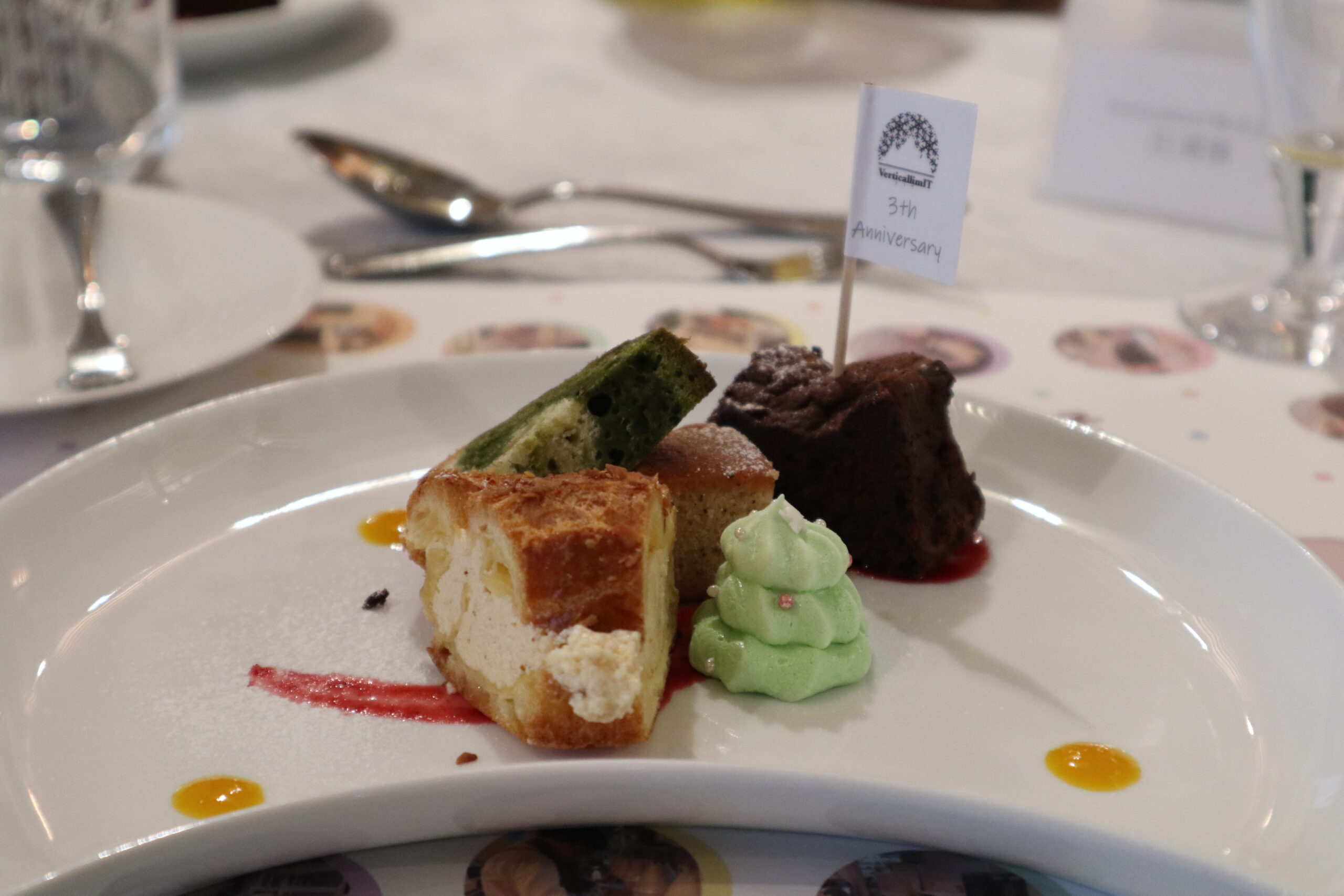 会社ロゴと、手書きの3周年の旗をデザートにつけていただき、感動しました。